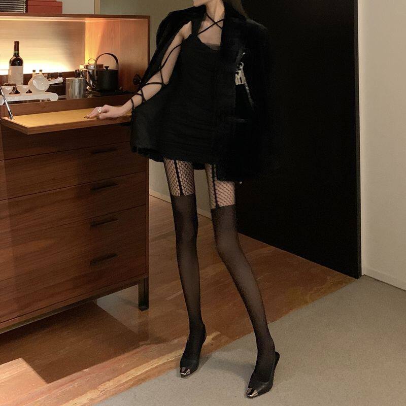 性感诱惑感交叉菱格大渔网红格袜长筒连裤黑丝袜ins潮薄款夏秋季