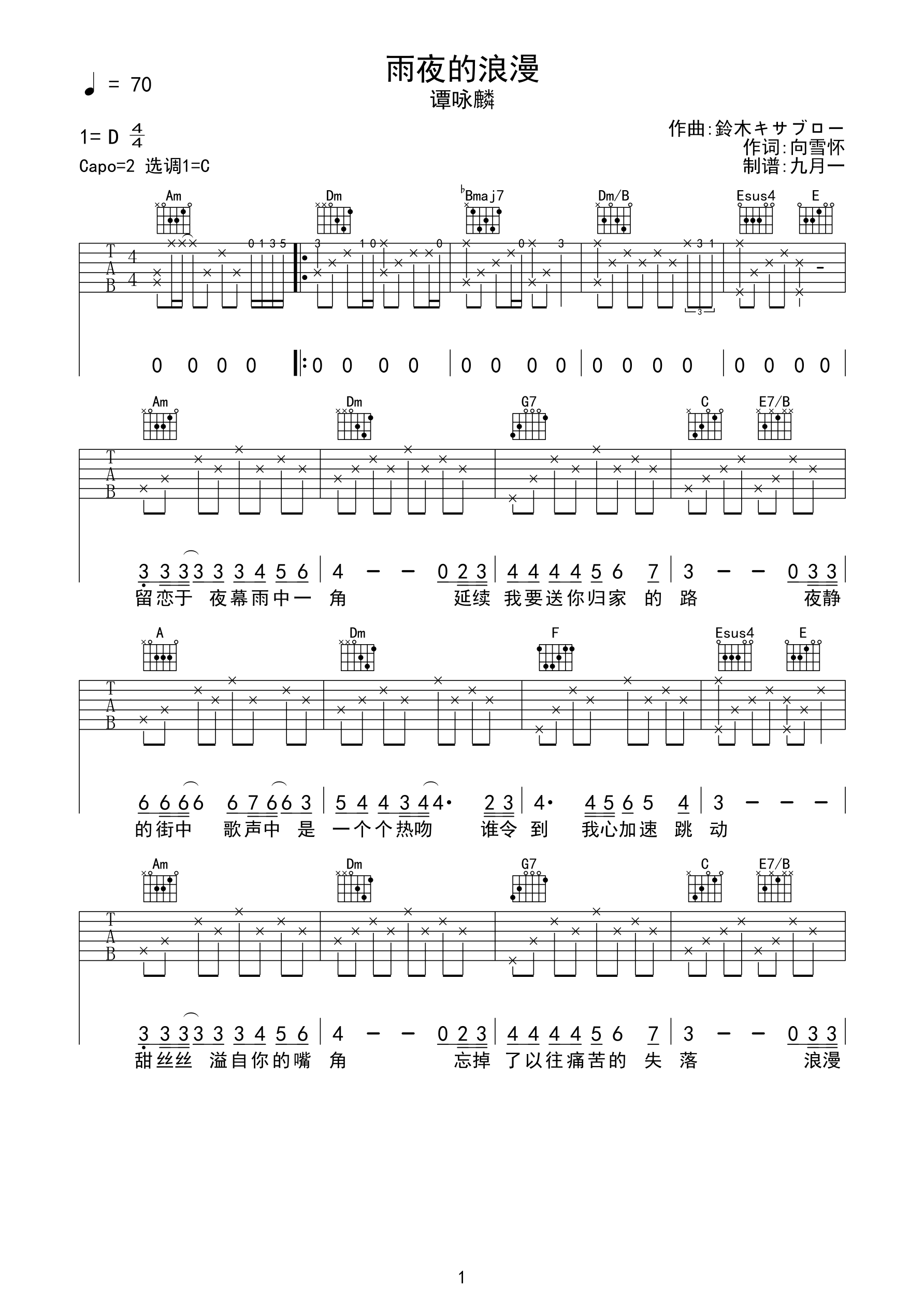 雨夜的浪漫-谭咏麟 完美c调完整版吉他谱c调六线pdf谱吉他谱-虫虫吉他
