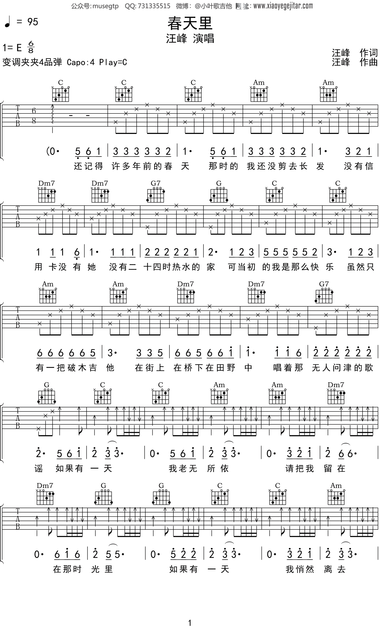 汪峰春天里吉他谱c调变调夹3品原调e唯音悦简单编配版