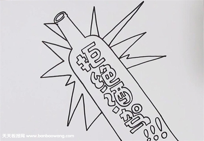 在酒瓶上写出主题"拒绝酒驾",在酒瓶的后面画上炸裂的形状