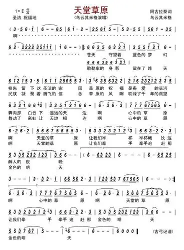 天堂草原简谱(歌词)-乌云其米格演唱-秋叶起舞记谱上传1