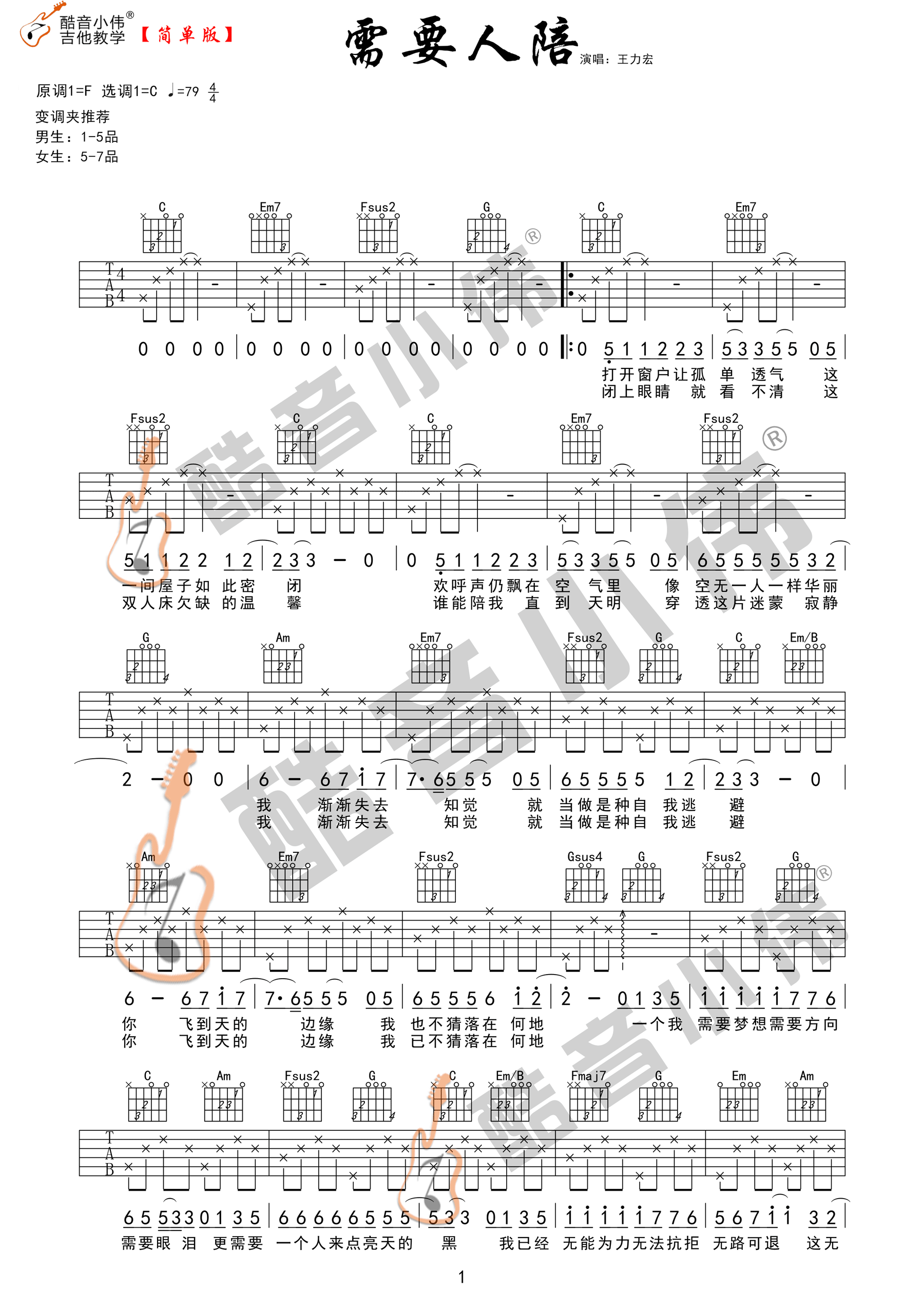 王力宏《需要人陪》吉他谱c调原版(酷音小伟吉他教学)吉他谱图片格式