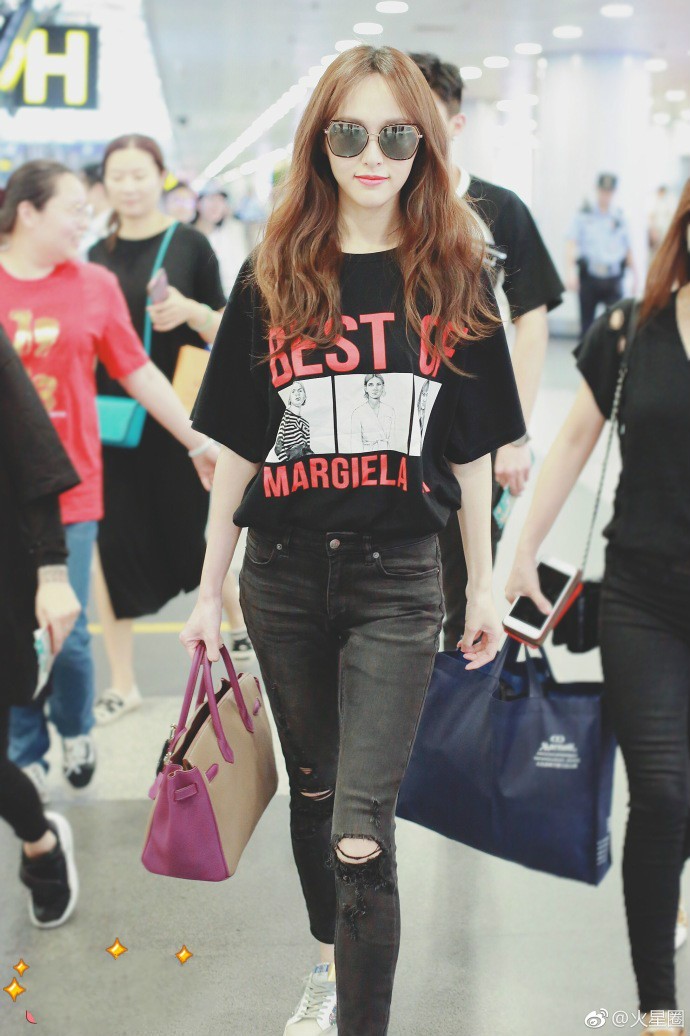 唐嫣穿黑色t恤搭配黑色破洞牛仔裤现身机场,新换的发色真好看!
