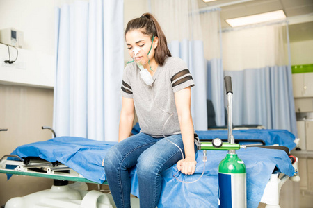 带着氧气面罩的受伤妇女