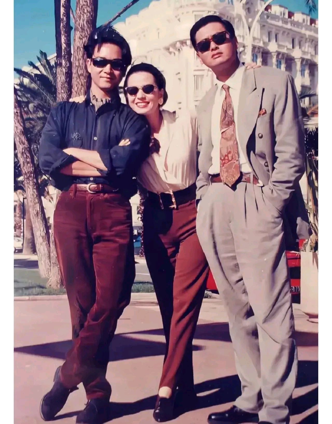 1990年,周润发,张国荣和钟楚红的合影,画面中三人都戴着墨镜,钟楚红靠