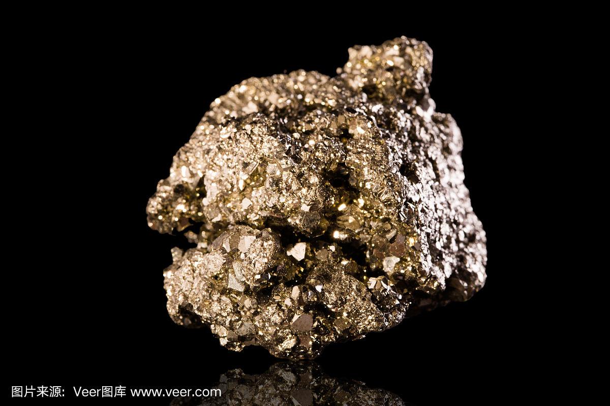 黑色背景上的黄铁矿石