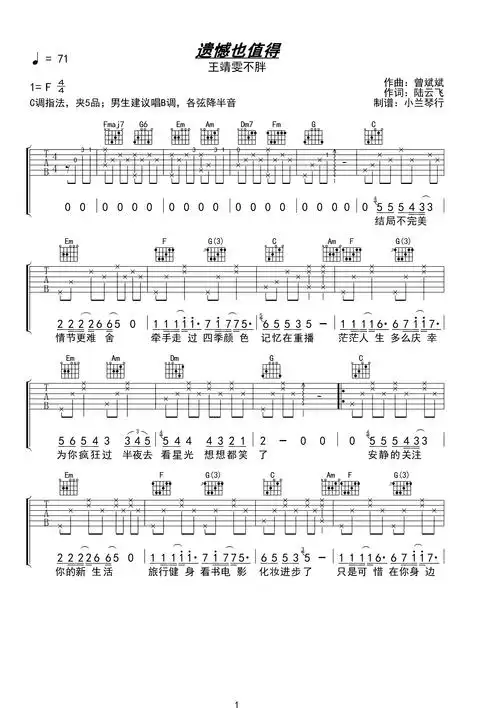 遗憾也值得吉他谱 c调简单版 王靖雯不胖 | 千里鹰歌谱网