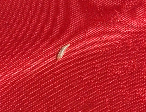 在床上发现一个红色的虫子,头粗尾部细,看不到脚,用两根木棍夹着能
