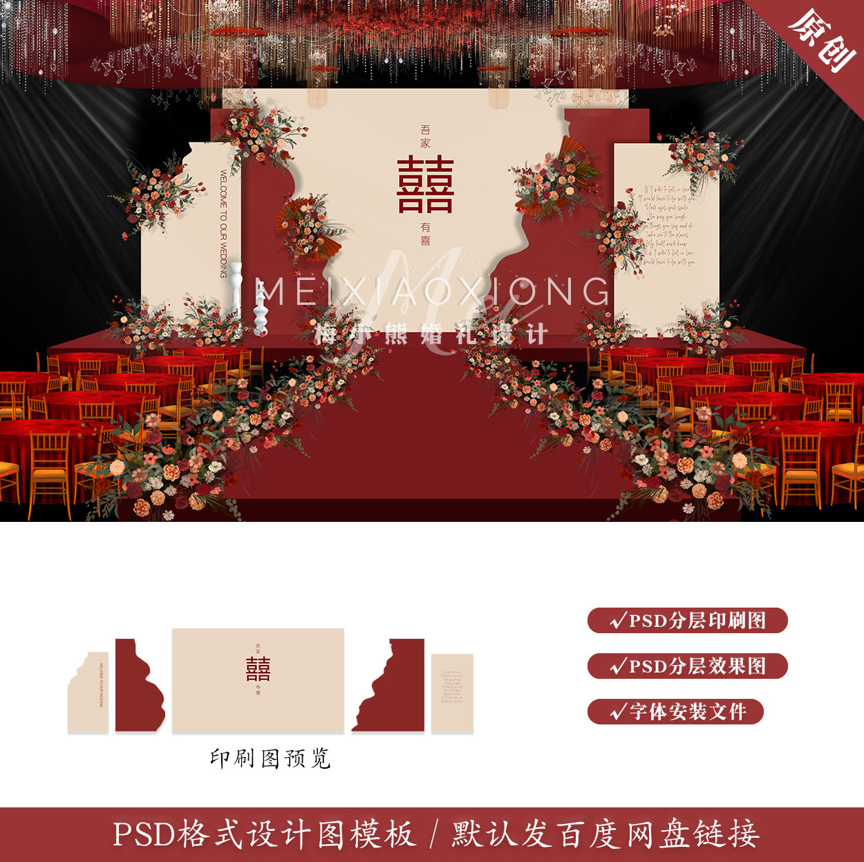 中国风香槟色红色新中式婚礼设计效果图 婚庆舞台布置背景psd素材