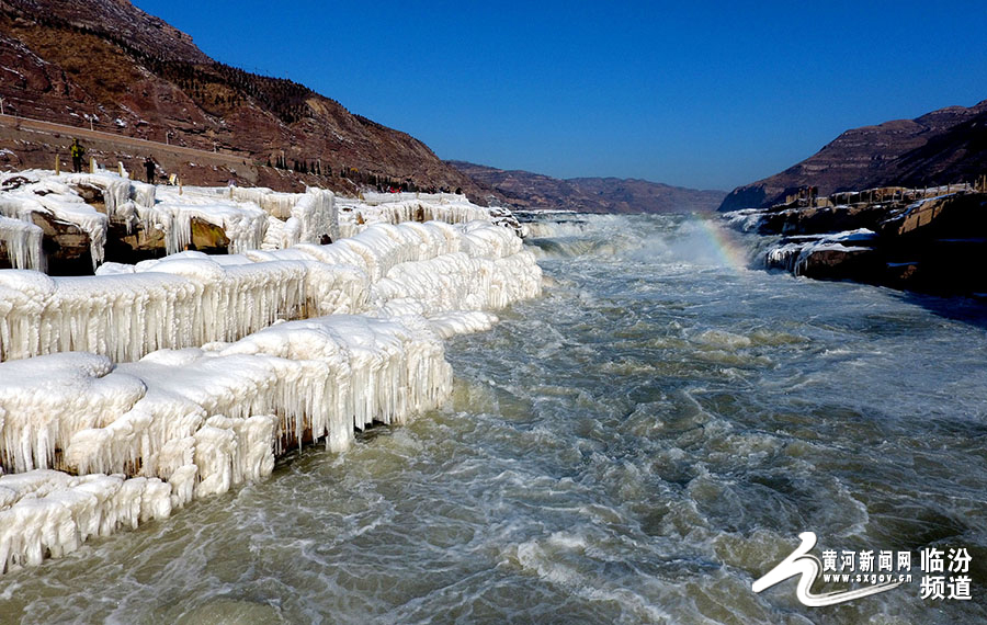 黄河壶口瀑布冬季奇景 冰挂与彩虹交相辉