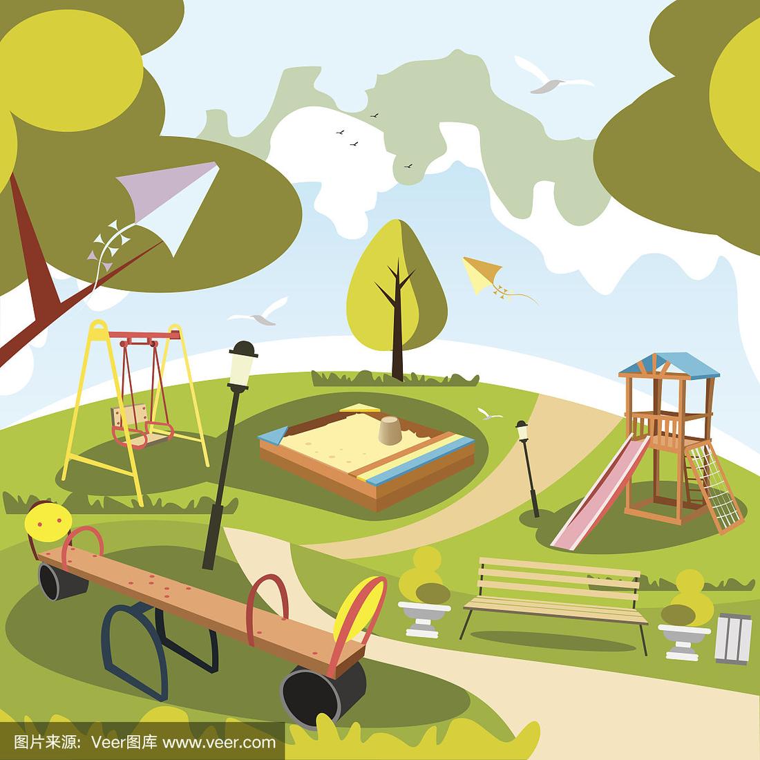 卡通城市公园儿童游乐场以自然为背景