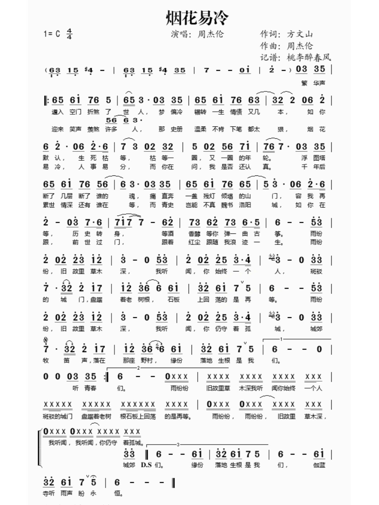 周杰伦 烟花易冷(原版)钢琴双手简谱 钢琴谱 钢琴简谱