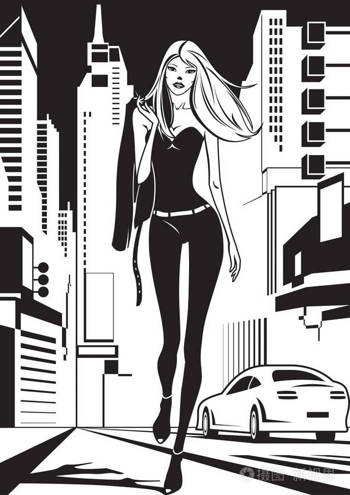 行走在城市街头的时尚美女手绘矢量素材