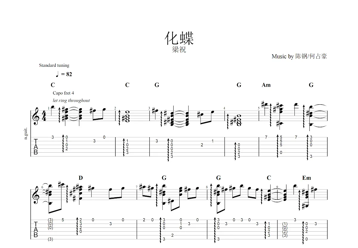 梁祝《化蝶》吉他谱_c调吉他独奏谱_简易独奏版