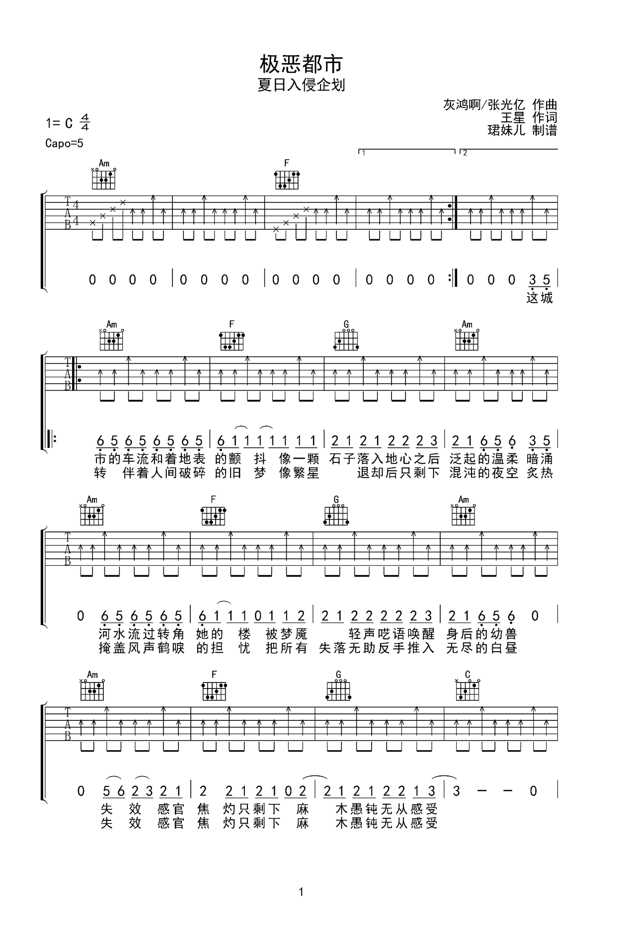 极恶都市吉他谱-夏日入侵企画-c调原版-附pdf图片谱