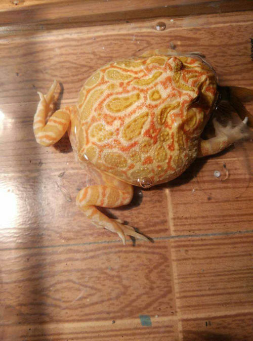 我买了只黄金血丝南瓜角蛙进口的,卖家从小养大的,现在大亚成,有拳头