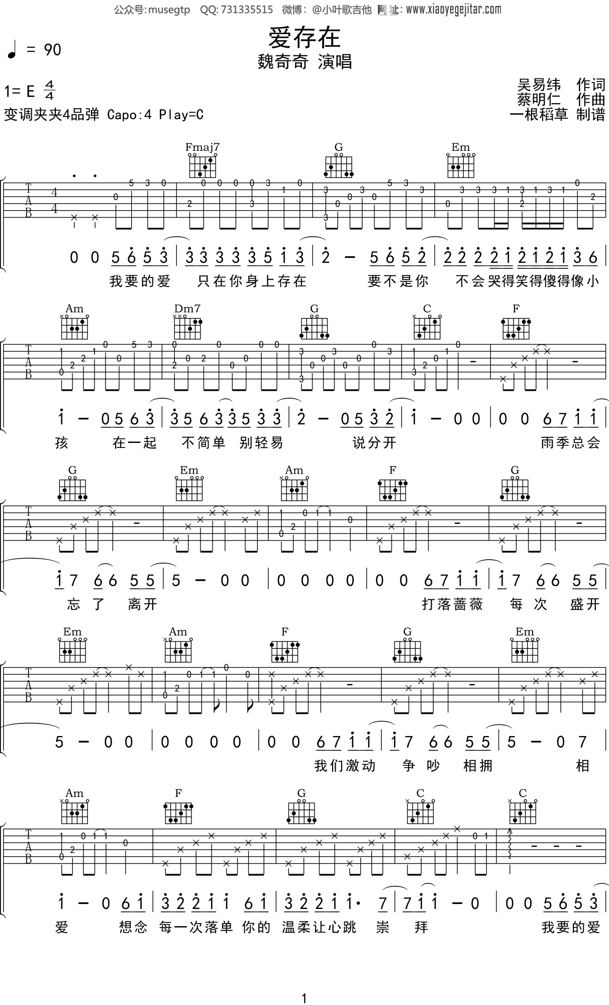 爱存在吉他谱 魏奇奇/王靖雯不胖1