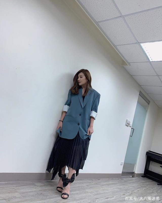 梁静茹工作闲时晒自拍,蓝色西装面带微笑状态超好