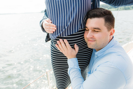 特写肖像开朗的年轻人抱着他怀孕的妻子的肚子.
