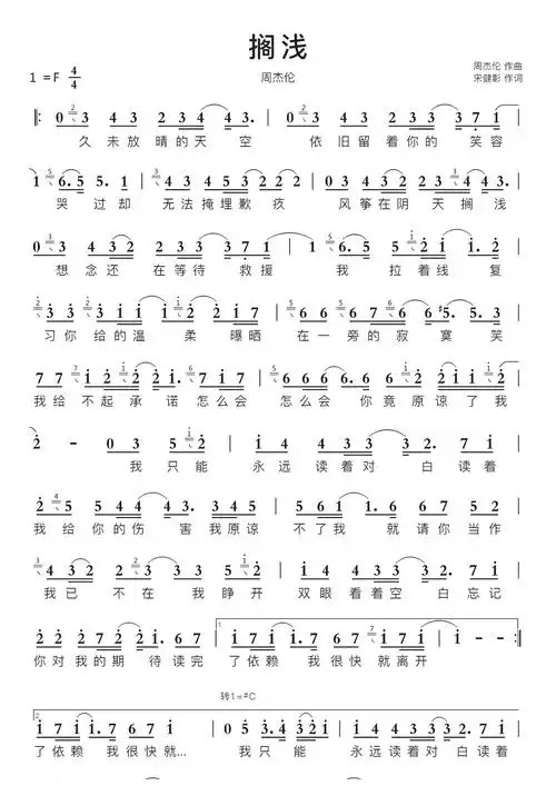 搁浅_周杰伦_f调 _流行钢琴双手简谱_钢琴谱|钢琴五线谱|钢琴简谱