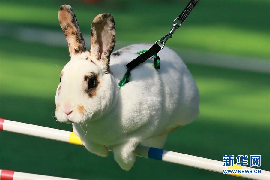4月1日,在捷克的克罗梅日什,一只兔子参加田径赛的跳跃障碍项目比赛