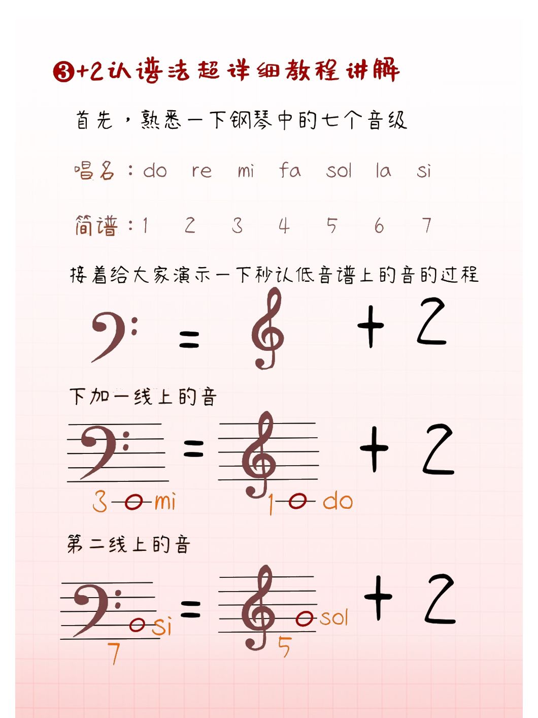 【 2认音法】在比较熟悉高音谱号后,低音谱号的音可以直接看作高音