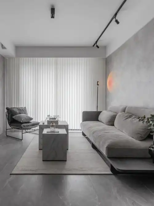 大气而又优雅;水泥艺术漆涂抹墙面,一组深灰色沙发,落日灯营造绝美的