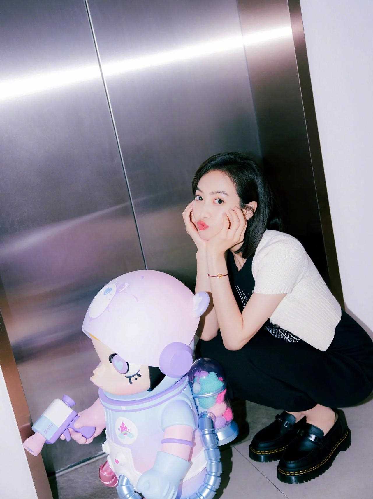 宋茜微博更新 黑色塔罗牌印花无袖连衣裙搭配白色短袖短款针织开衫