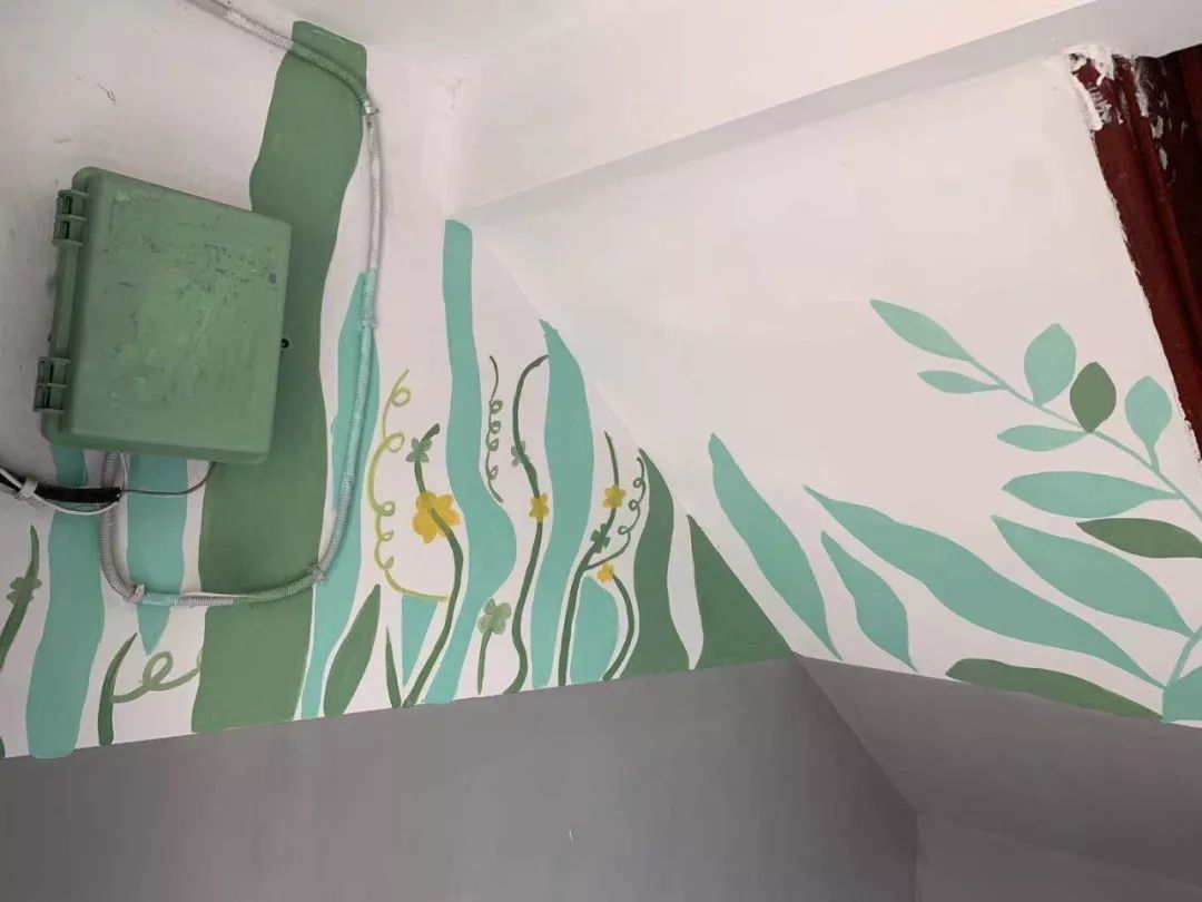 你看楼梯下墙绘,色彩多清新淡雅呀!