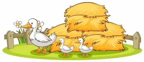 草垛下面的卡通鸭妈妈带着小鸭子在散步png图片免抠矢量素材