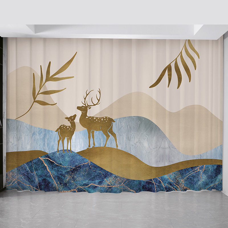 北欧窗帘现代简约轻奢新中式招财麋鹿客厅金色大气卧室遮光布纱帘