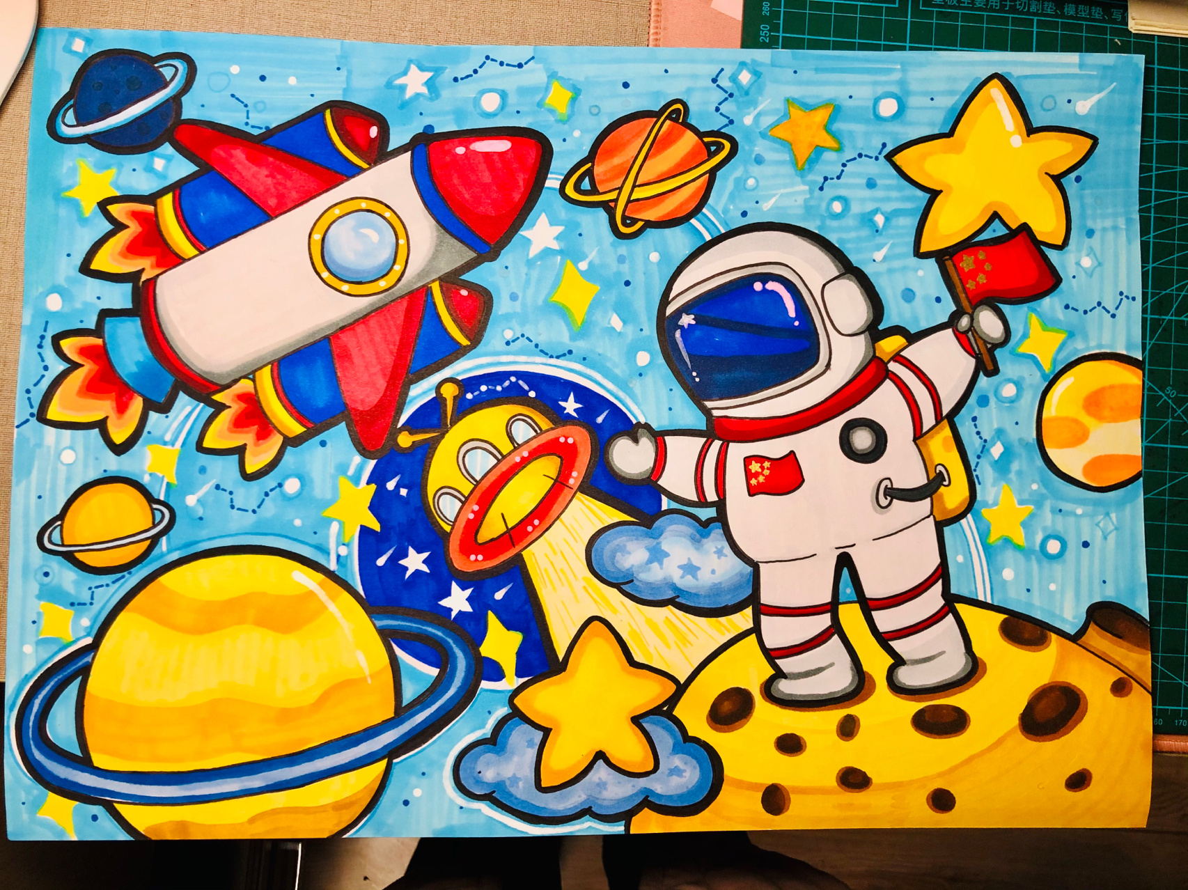 儿童科技主题画 临摹 的马克笔儿童科学幻想太空画 用水彩笔跟马克笔