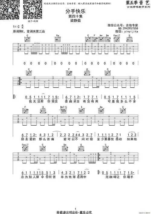 分手快乐吉他谱_c调_梁静茹《分手快乐》弹唱六线谱1