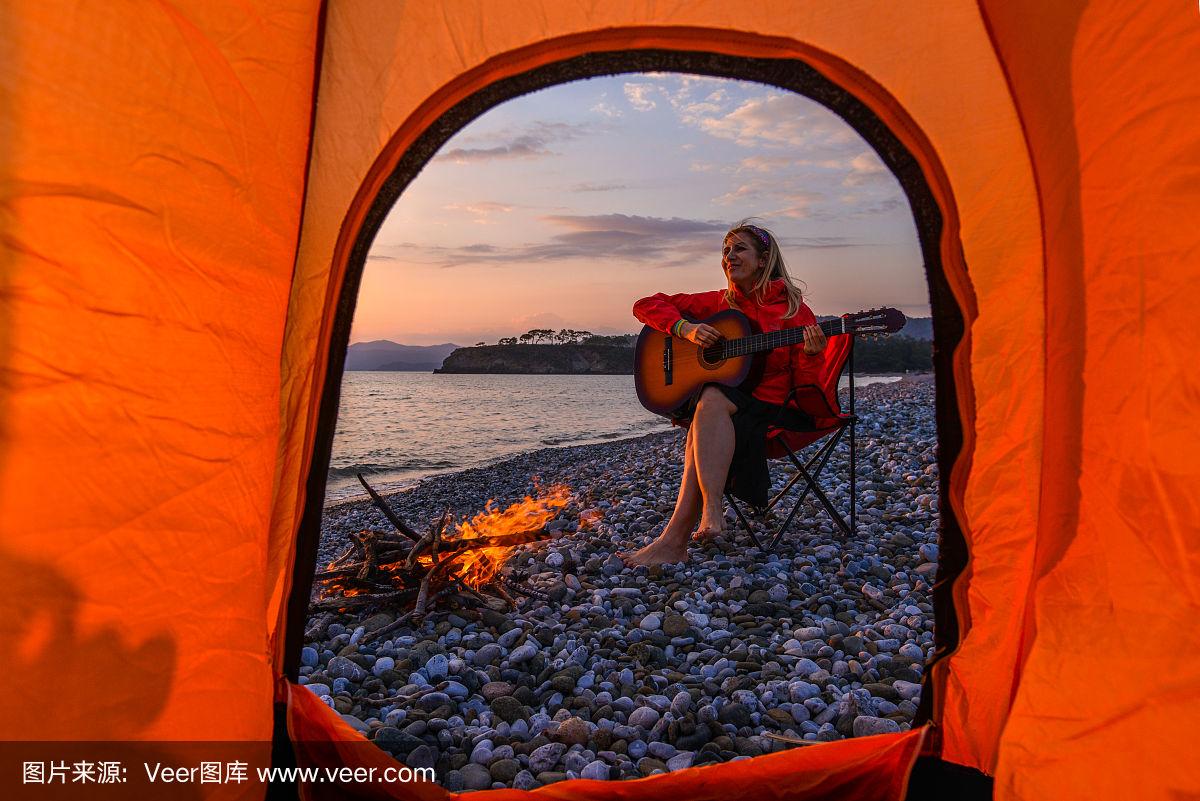 年轻女子在海边弹吉他