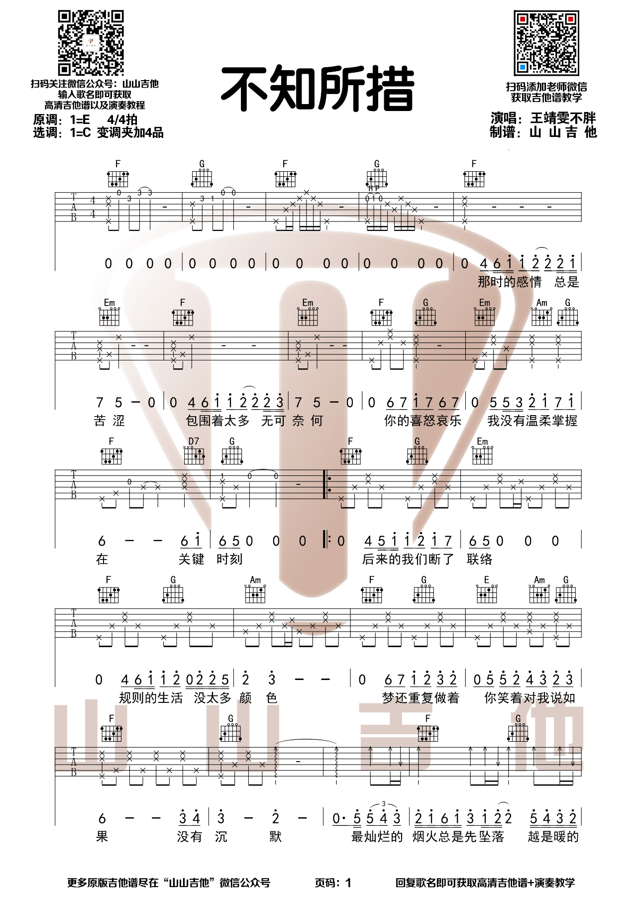 不知所措吉他谱王靖雯c调高清弹唱谱
