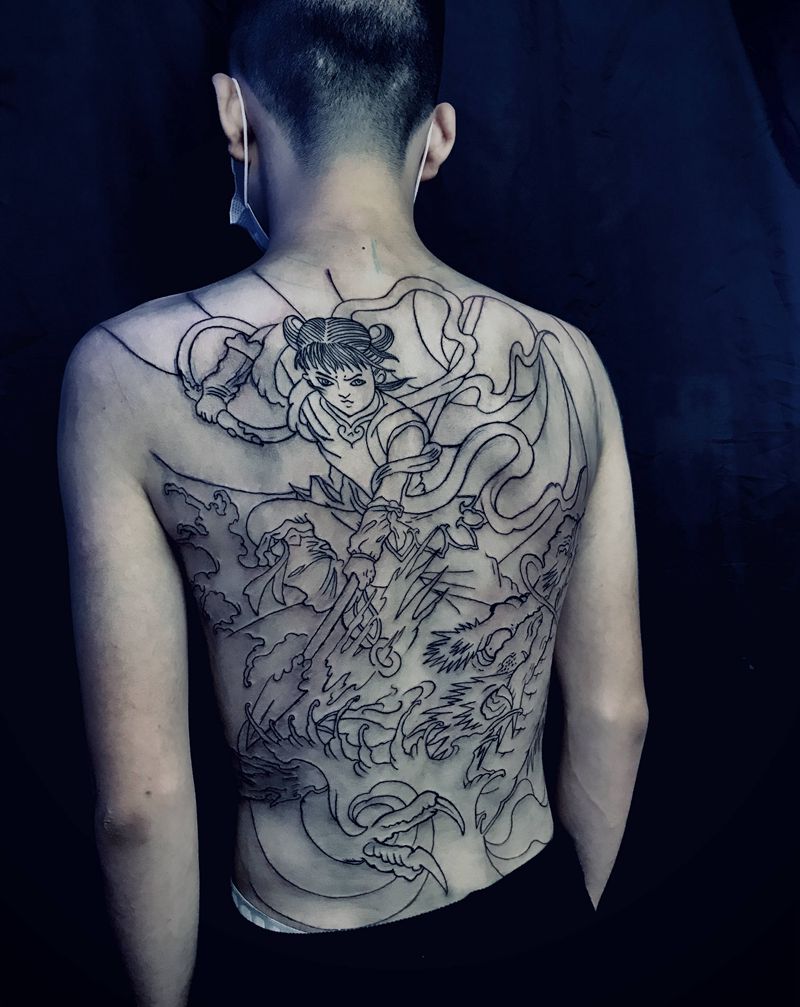 哪吒62满背线条纹身图片背部纹身图案