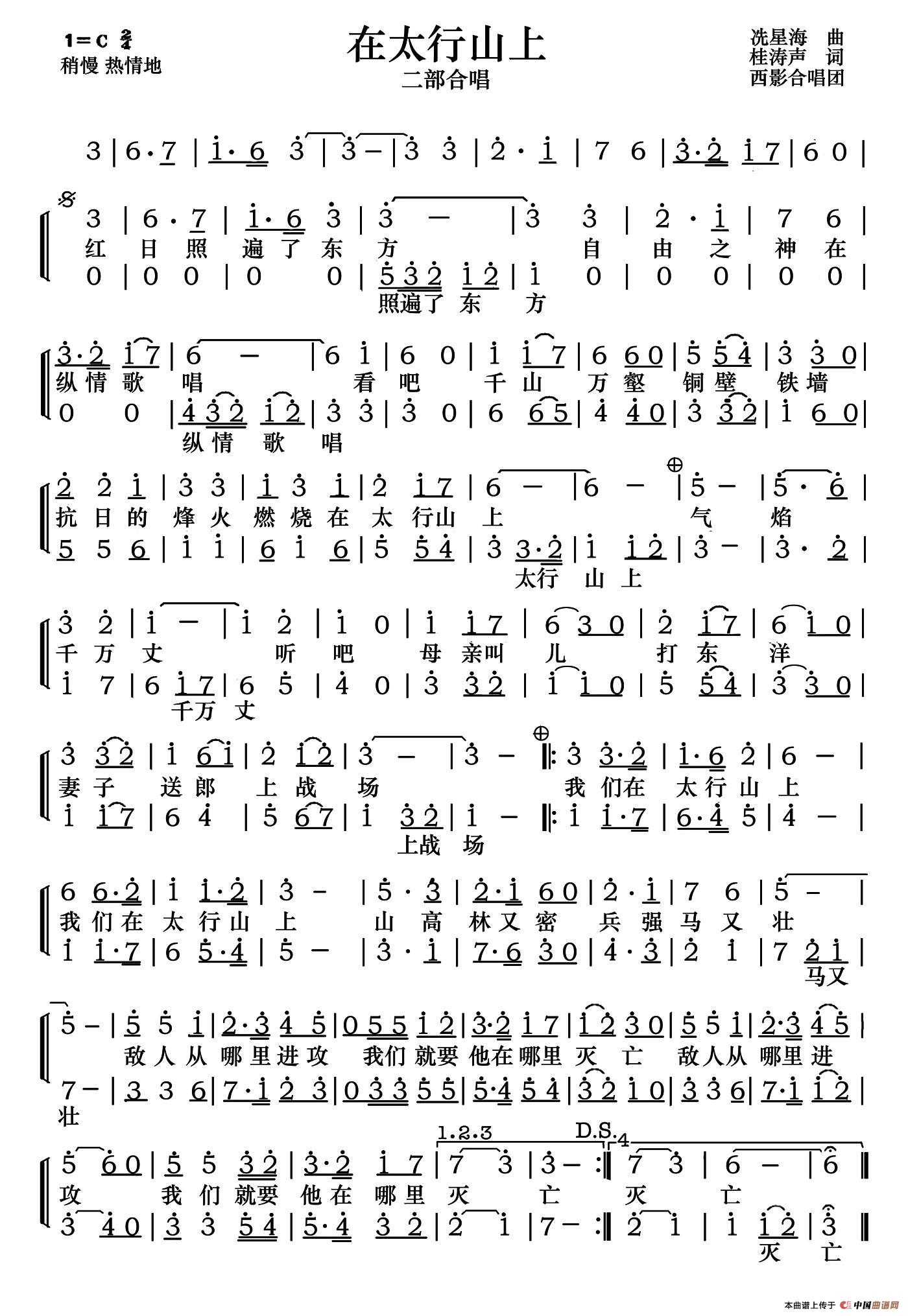 在太行山上二声部西影合唱团演唱谱