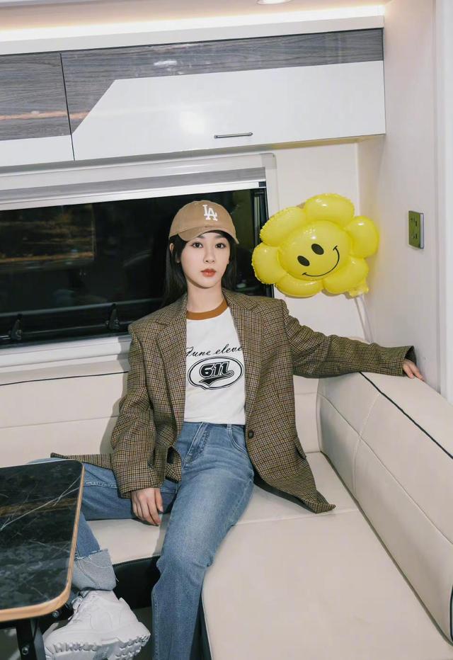 杨紫情人节晒照,穿格纹西装搭配蓝色牛仔裤,时尚又减龄