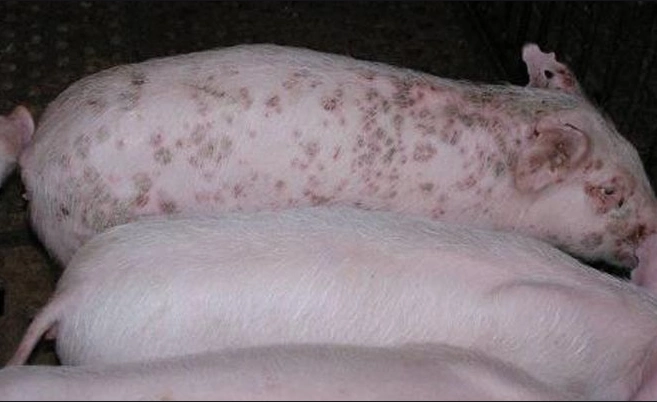一些猪在感染了皮炎肾病综合征以后,身上也会出现一些比较大的圆形
