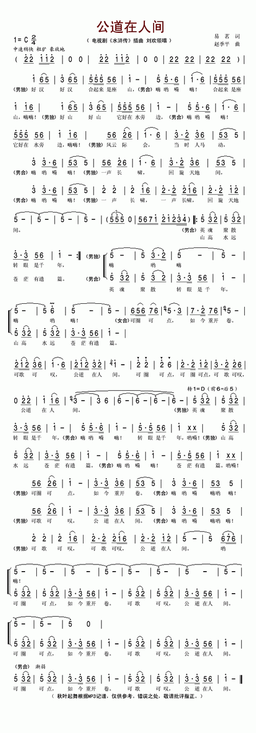 公道在人间刘欢电视剧水浒传插曲简谱