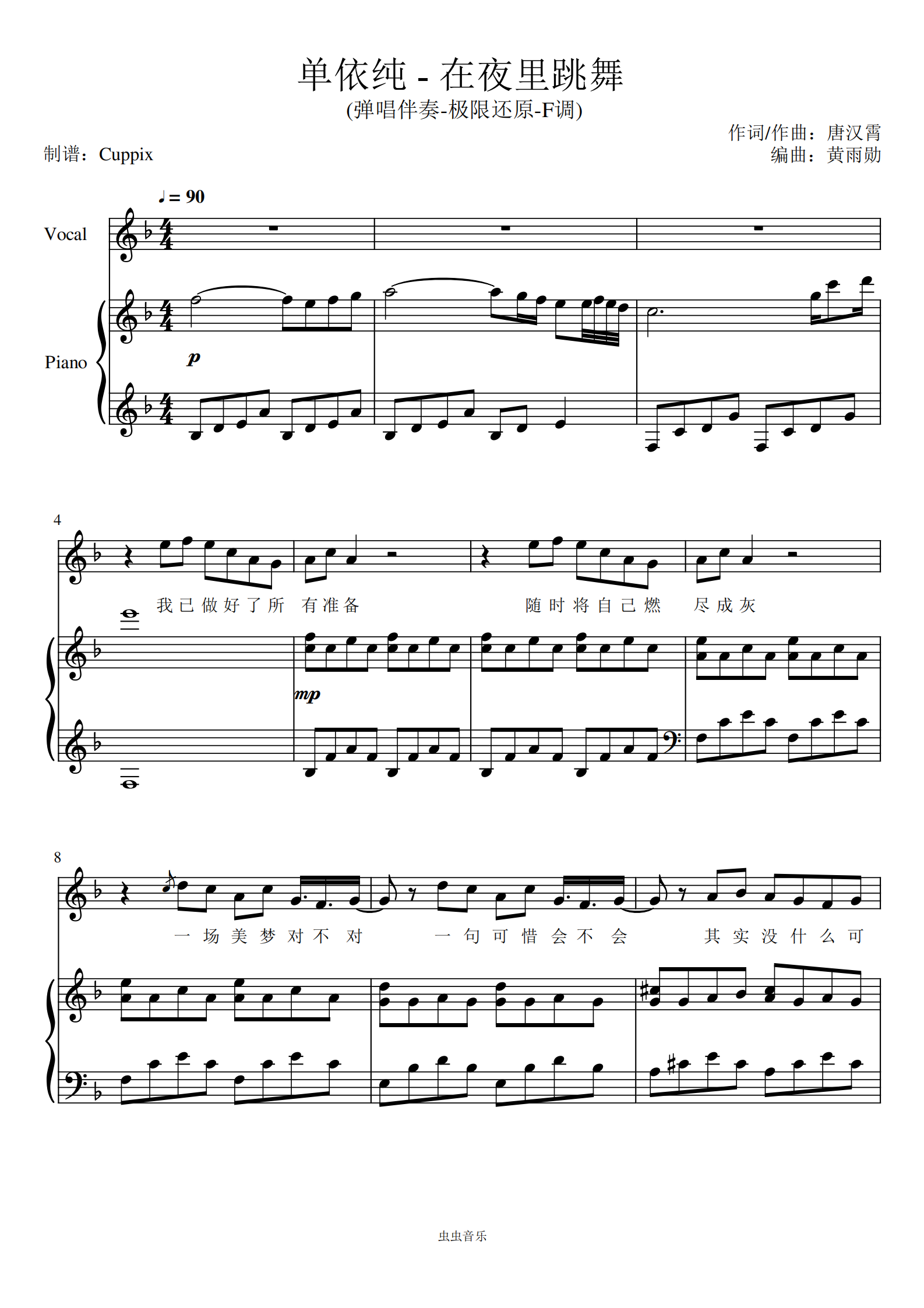 《在夜里跳舞》弹唱伴奏附词-f调版-极限还原(单依纯)钢琴谱-cuppix