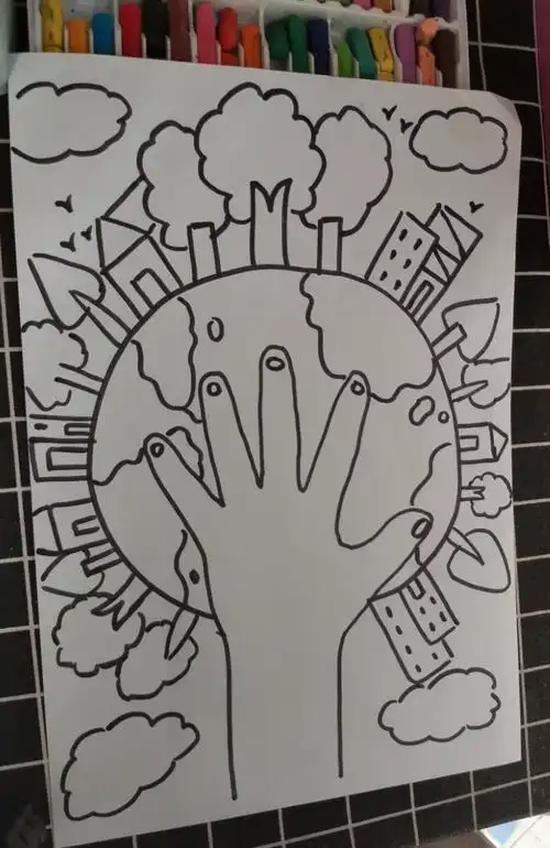 世界地球日儿童绘画黑白线描可涂色保护地球a4/a3/8k海报空白模板