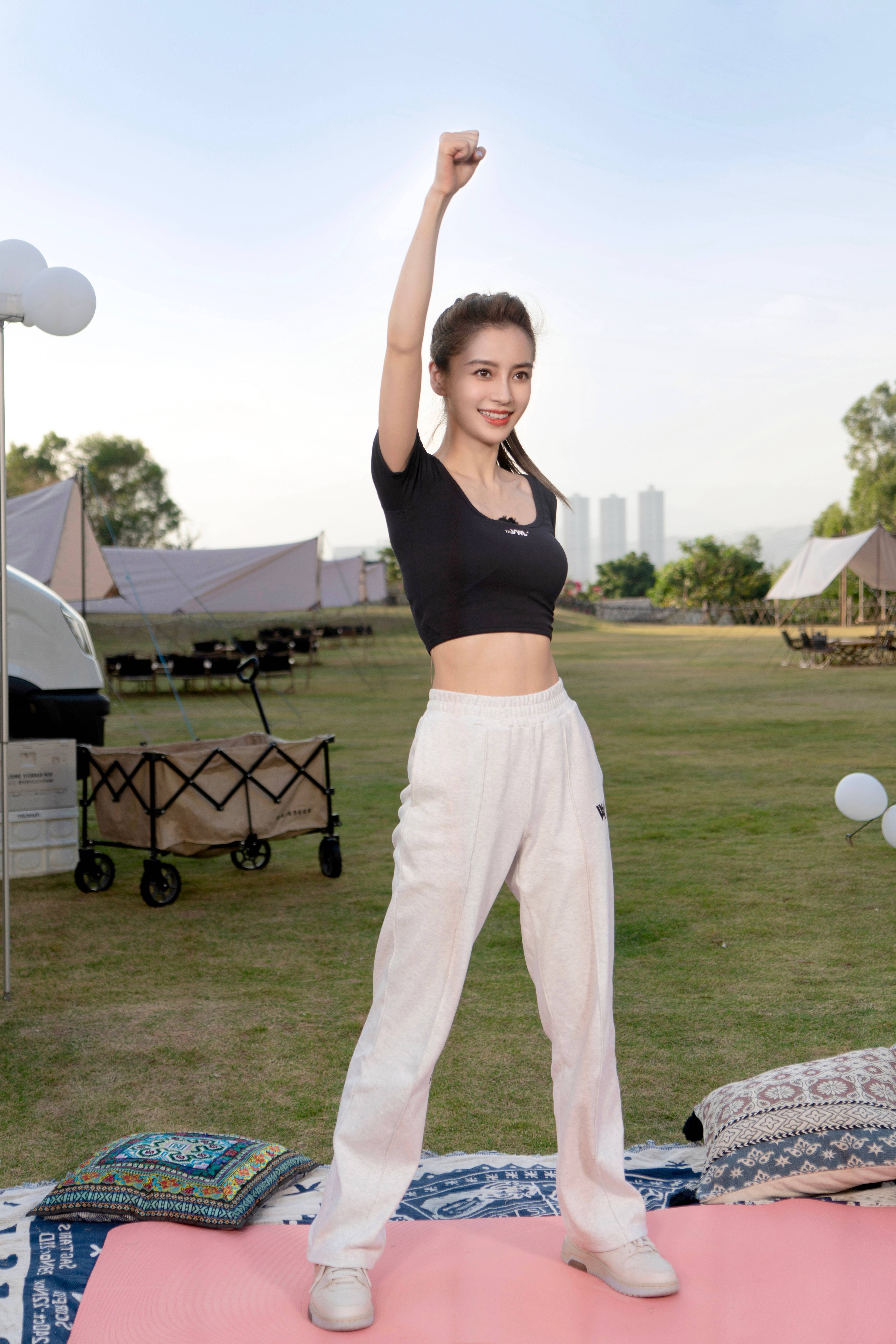 杨颖穿黑白休闲运动装大秀肌肉和小蛮腰,清纯甜美,楚楚动人!