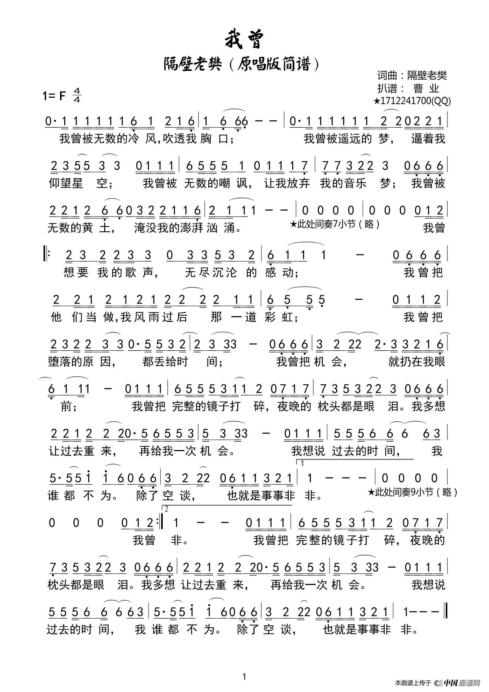 我曾(原唱版简谱,曹业扒谱版)