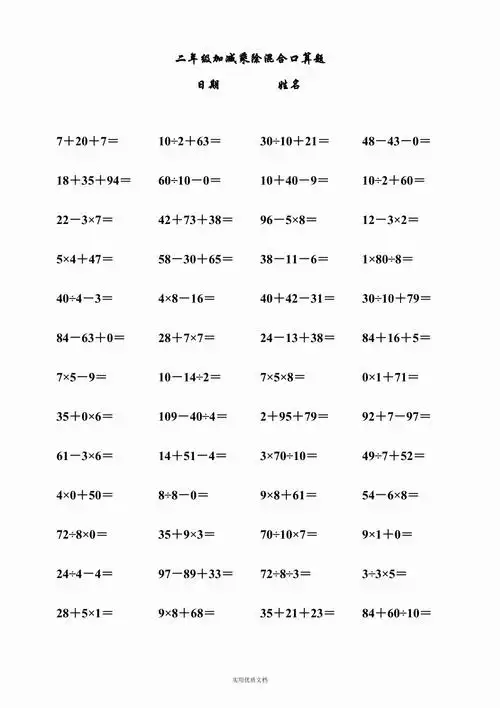 二年级加减乘除混合口算题