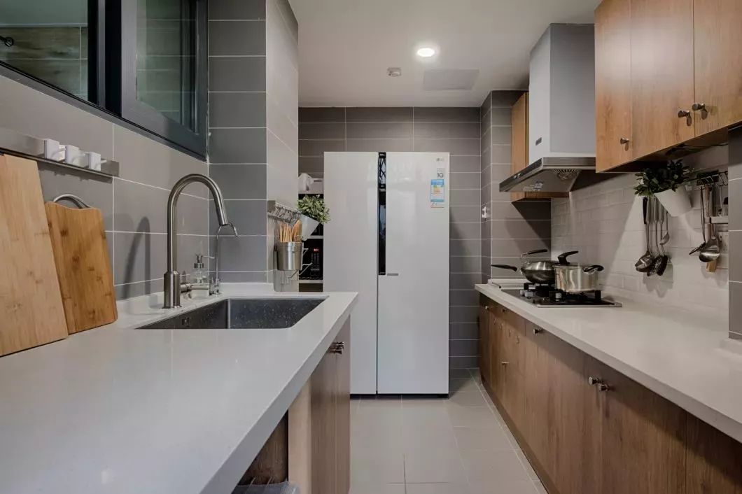 二字型的厨房,在灰色地面 白色墙面砖的结合下,装上木色门的橱柜,小
