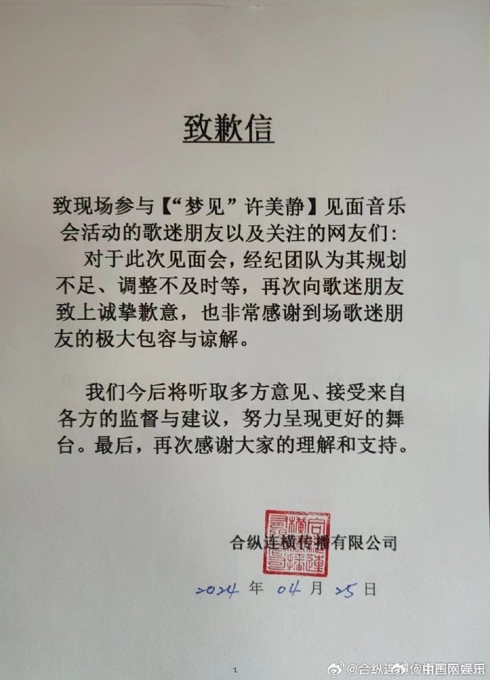 许美静经纪公司道歉信##许美静南京主办方道歉信