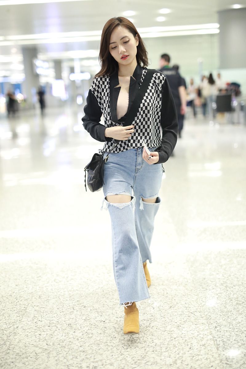 街拍:刘惜君紫色运动外套 破洞牛仔裤 渔夫帽随性率性_北京_机场