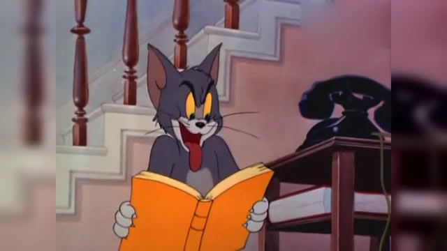 猫和老鼠:杰瑞鼠在桌子上偷吃时,被准备打电话的汤姆猫发现了