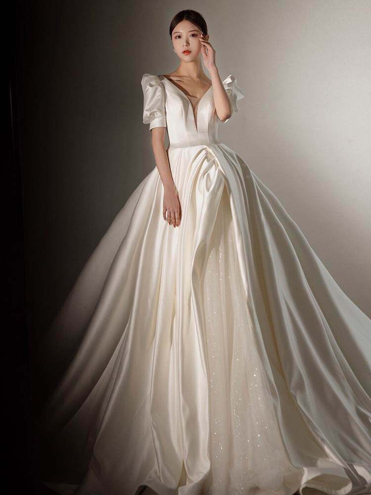 泡泡袖方领气质婚纱礼服缎面优雅2021夏新款性感v在逃公主拖尾纱